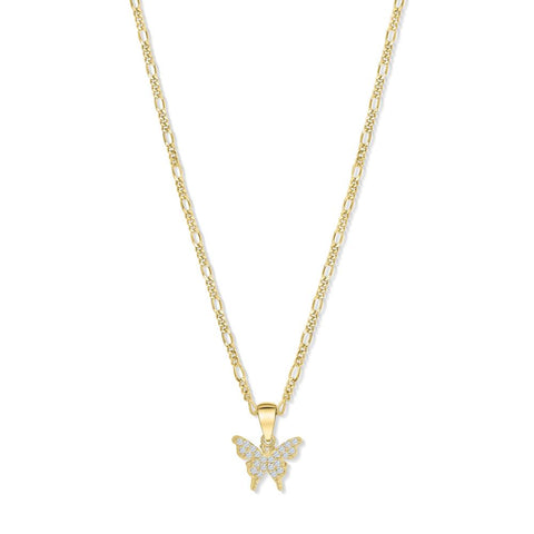 Our butterfly pendant is built with the highest quality 14k gold vermeil over a decent 925 pure sterling silver that helps it shine like never before. This remarkable pendant is decorated with only the finest 5A CZ white crystal diamonds. This pendant is descended through an italian figaro chain in the shade of a perfect 14k honey gold, having the measurements of 16" + 2" inch extender. This amazing necklace will make you feel as if you can accomplish anything with just the power of believing in yourself